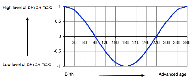 My experience has been that the older I get, the easier I find it to listen to my parents. It’s paradoxical in one sense. When you are younger and less mature, you might expect to be more in need of the sage counsel of parents. At the same time, while one develops their own firm views of life, there is a tendency to perhaps discount alternate suggestions. After marriage, one ought to learn the art of joint decision-making. Someone who ignores the views of their spouse, may also ignore the requests from their parents. There are pathological extremes, but they aren’t in my purview. When one is more “independent” that doesn’t mean they don’t show כבוד or יראה to their parents. There is perhaps something missing: the element of being able to be מבטל one’s approach and adopt the (sensible) wishes of one’s parents. Graphically, I’d present it like this. Your mileage may vary. The cosine coefficient varies for different people of course.