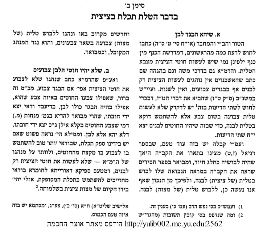 The Mishna Brura opines that it is best to wear a pure white garment and white Tzitzis, as in this way one fulfills both the opinion of the Ramoh and the Mechaber.